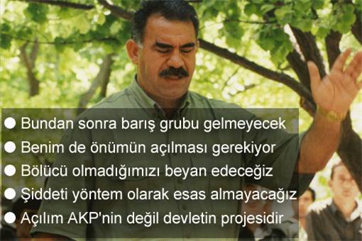 Öcalan’ın “yol haritasında”, “Benim de önümün açılması gerekiyor” dedi. “Yol haritasında” “Kürtlerin “şiddeti devreden çıkarması”, “kendi kendilerini yönetmeye imkan tanınması” da yer alıyor. PKK’nın lideri Abdullah Öcalan, demokratik açılım sürecine ilişkin üç aşamalı yol haritasını açıkladı. Öcalan, bundan sonra Türkiye’ye gelmeleri için yeni grup çağırmayacağını söyledi. ANF’nin haberine göre, Öcalan İmralı’da avukatlarıyla yaptığı görüşmede, yol haritasını üç aşamalı olarak açıkladı. Öcalan, yol haritasını şöyle anlattı: