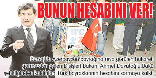 Ne diyecek? BU arada rezaletin baş sorumlularından Bursa Valisi Şahabettin Harput, stada sokulmayan Azerbaycan bayraklarının WC yazılı kutulara atılması konusunda suskunluğunu sürdürüyor. Harput, bugün açıklama yapacağını söyledi. Azerbaycan bayrağı kime emanetti! Bursa’da Azerbaycan bayrağına reva görülen hakareti görmezden gelen Dışişleri Bakanı, Bakü şehitliğinden kaldırılan Türk bayraklarının hesabını sormaya kalktı.