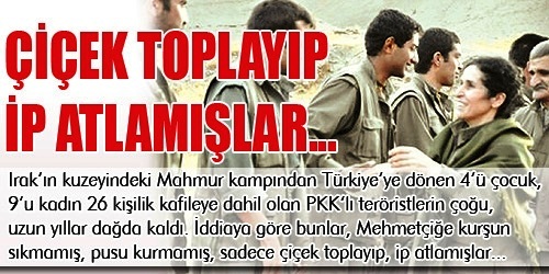 İddiaya göre bunlar, Mehmetçiğe kurşun sıkmamış, pusu kurmamış, sadece çiçek toplayıp, ip atlamışlar… Kandil’de ip atlamışlar! İmralı’da cezasını çeken bölücübaşı Abdullah Öcalan’ın çağrısı üzerine dağdan inen PKK’lılar, inlerini birer kahraman edasıyla terk etti. Yurda giriş yapan teröristler, zılgıtlarla karşılandı. Şırnak’a giderek Silopi’de PKK’lıları karşılayan DTP’li milletvekillerinin hayli mutlu oldukları gözlendi.