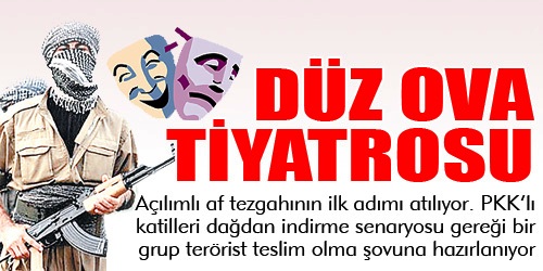 AKP’nin başlattığı, Öcalan’ın da sahiplendiği sözde Kürt açılımı tiyatroya dönüştü. Yıllarca Mehmetciğe kurşun sıkıp, çocuk yaşlı demeden katliam yapan bölücü örgüt üyeleri ‘açılımın önünü açmak’ için Habur sınır kapısında teslim olacak. Barış grubuymuş! TESLİM gösterisinde rol alacak 100 kişilik üç PKK’lı gruptan ikisi bugün Türkiye’ye giriş yapacak. Mahmur ve Kandil’den gelecek grupları, DTP Genel Başkanı Ahmet Türk ve bazı sözde aydınların olduğu kalabalık bir grup karşılayacak.