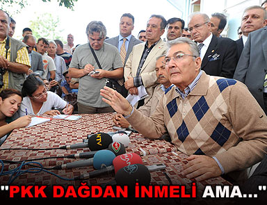 CHP Genel Başkanı Deniz Baykal, PKK terör örgütü üyelerinin dağdan inmesi gerektiğini belirterek, “Ama bu Türkiye üzerinde yapılmış olan pazarlığın ön ödemesi olarak uygulanmamalıdır” dedi. Baykal, geçtiğimiz çarşamba günü sel felaketinin yaşandığı Antalya’nın Kumluca ilçesi Beykonak Beldesi’ni ziyaret etti. Baykal, ziyarette gazetecilere yaptığı açıklamada, PKK terör örgütü üyelerinden bazılarının teslim olacağı iddialarına ilişkin değerlendirmelerde bulundu.