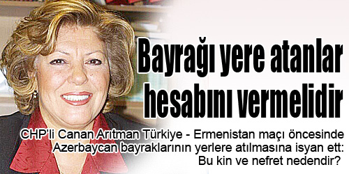 CHP’li Canan Arıtman Türkiye – Ermenistan maçı öncesinde Azerbaycan bayraklarının yerlere atılmasına isyan ett: Bu kin ve nefret nedendir? Yakında Nobel de alırlar CHP’li Arıtman, Ermenistan-Türkiye maçı öncesinde toplanan Azerbaycan bayraklarının yerlerde süründürülmesine ve protokollere isyan etti: Yazıklar olsun. Bayrağa bile tahammül edemediler.