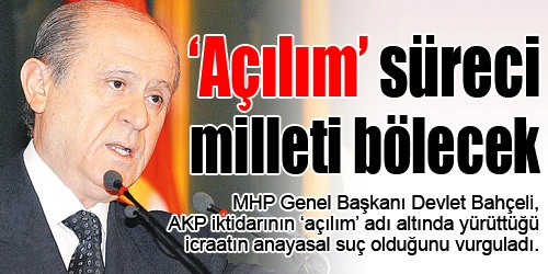 MHP Genel Başkanı Devlet Bahçeli, AKP iktidarının ‘açılım’ adı altında yürüttüğü icraatın anayasal suç olduğunu vurguladı. Önemsizmiş gibi gösterilerek atılmak istenen adımların, çok büyük siyasal, sosyal sorunlar doğuracağına işaret eden Bahçeli, “Bu süreç, Türk milleti’ni bölünmeye sürükleyecek” dedi.
