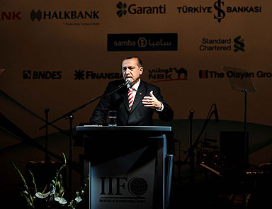 Başbakan Recep Tayyip Erdoğan İstanbul’da Uluslararası Finans Enstitüsü’nün gala yemeğinde konuştu, “İstanbul’u dünyanın finans merkezi yapmaya çalışıyoruz” dedi. Finansal korumacılığa karşı olduğunu vurgulayan Erdoğan, kredi derecelendirme kuruluşlarını eleştirdi, “İdeolojik davranıyorlar, kredilerini yitiriyorlar” diye konuştu. Erdoğan, uluslararası camianın, küresel krizin olumsuz etkilerini en aza indirecek adımların işbirliği ve koordinasyon içinde atılması konusunda son 1 yılda başarılı bir sınav verdiğini belirterek, yaşama geçirilen düzenlemelerin olumlu etkilerini gösterdiğini ve dünya ekonomisinin iyileşme sürecine girdiğini söyledi.