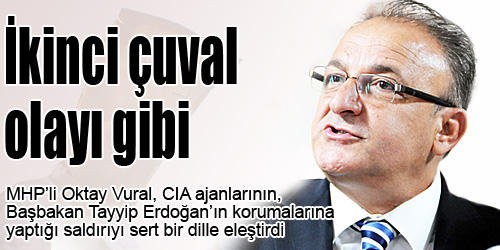 MHP’li Oktay Vural, CIA ajanlarının, Başbakan Tayyip Erdoğan’ın korumalarına yaptığı saldırıyı sert bir dille eleştirdi. İkinci çuval olayı gibi CIA ajanlarının, Erdoğan’ın korumalarına yaptığı saldırıyı eleştiren MHP’li Oktay Vural, “Her ne sebeple olursa olsun, yapılan muameleyi kınıyorum” dedi. MHP Grup Başkanvekili Oktay Vural, Başbakan Recep Tayyip Erdoğan’ın ABD ziyareti sırasında korumalar arasında yaşanan tartışmayı çuval olayına benzetti. Partisinin İzmir İl Başkanlığında basın toplantısı düzenleyen Vural, Başbakan Recep Tayyip Erdoğan’ın ABD ziyaretinin “hangi amaçla ne için yapıldığı bilinmeyen” bir gezi olduğunu ileri sürdü.