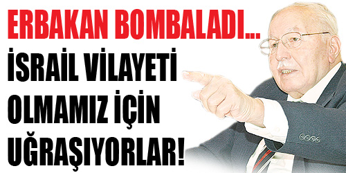 İsrail vilayeti olma peşinde koşuyorlar Eski Başbakanlardan Necmettin Erbakan, AKP’nin İsrail’e vilayet olmak istediğini söyledi. Erbakan, Saadet Partisi Ankara İl Başkanlığının bir düğün salonunda düzenlediği bayramlaşma törenine katıldı. Salona girişinde, “Mücahit Erbakan” sloganları eşliğinde karşılanan Erbakan, konuşmasını kürsü yerine oturduğu yerden yapmayı tercih etti. AB’ye girmenin Hristiyanlaşmak olduğunu öne süren Erbakan, “Diğer partilerin yeni bir dünya kurma ideali yoktur ama Saadet Partisi’nin vardır” dedi.