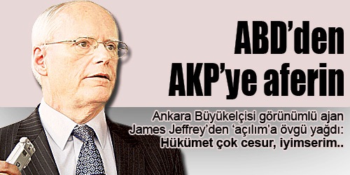 Ankara Büyükelçisi görünümlü ajan James Jeffrey’den ‘açılım’a övgü yağdı: Hükümet çok cesur, iyimserim… SÖZDE Kürt sorununun çözümü için sık sık akıl veren ABD’nin Ankara Büyükelçisi James Jeffrey AKP’nin ’açılım’ performansına methiyeler dizdi, bazı detaylara karşın sürecin çok iyi gittiğini ifade etti. Sırada ekonomik adım varmış! JEFFREY, “Türk hükümeti çok cesur hareket ediyor. Çok iyimserim süreç hakkında. Sanıyorum terörün kökünü kurutmaya yönelik, ekonomik adımlar da atılacak” dedi.