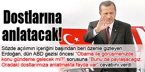 SÖZDE açılımın içeriğini başından beri özenle gizleyen Başbakan Erdoğan, dün ABD gezisi öncesi “Obama ile görüşmenizde konu gündeme gelecek mi?” sorusuna “Bunu da paylaşacağız. Oradaki dostlarımıza anlatmakta fayda var” cevabını verdi. Dostu Obama’ya anlatacak Muhalefetin tüm uyarılarına rağmen rest çekip ABD’ye giden Başbakan Erdoğan, açılımı oradaki dostlarına anlatmakta fayda olduğunu söyledi Başbakan Recep Tayyip Erdoğan, AKP’nin açılımını ABD Başkanı Barack Obama’nın da aralarında bulunduğu dostlarına anlatacak. Muhalefetin milli birlik vurgusuna aldırmayan Erdoğan, New York’taki BM 64. Genel Kurulu ile Pitsburg’daki G-20 zirvesine katılmak üzere özel uçak “ANA” ile saat 13.40’da ABD’ye gitti.
