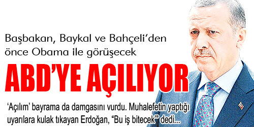 BAŞBAKAN, BAYKAL VE BAHÇELİ’DEN ÖNCE OBAMA İLE GÖRÜŞECEK Liderlerin bayram mesajları adeta restleşmeye döndü. Baykal, “Milyonlarca işsiz, şehitlerimizin acısı ve milli birliğimizi parçalamaya yönelik arayışlar yüzünden buruk bir bayram geçiriyoruz” derken, Bahçeli de sert bir mesaj verdi: Tahrip edilmek istenen milli birliğimize yönelik kirli oyunlar tarihin çöplüğüne gidecek! Açıkça meydan okudu ŞİMDİYE dek gizli oturum dahil, muhalefeti bir şekilde ‘açılım’a ortak etmeye çalışan Başbakan Erdoğan ise “Hedefe kilitlendik. Bu iş yakında bitecek!” mesajı verdi. 23-30 Eylül’de New York’ta gerçekleştirilecek BM Genel Kurulu ile G-20 Zirvesi’ne katılacak olan Erdoğan’ın Obama ile de bir görüşme gerçekleştirmesi bekleniyor.