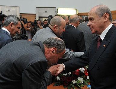 Kürt açılımının dış kaynaklı olduğunu savunan MHP Genel Başkanı Devlet Bahçeli, Başbakan Erdoğan’ın Amerika ziyaretini ‘Başbakan’ın ABD’den hangi onaylanmış paket değerleri ile geleceği merak edilmektedir” sözleriyle değerlendirdi. Parti üyeleri ile bayramlaşan Bahçeli, Meclis’te düzenlenmesi planlanan kapalı oturumda konuşulanları açıklama fikrinde kararlı olduklarını da yineledi: “Cezası ne ise katlanırız.” Bahçeli, Ramazan Bayramı dolayısıyla partisinin genel merkezinde, partililerle bayramlaştı. Burada konuşan Bahçeli, Ramazan ayının sel, trafik kazası ve terörle mücadelede birçok Mehmetçiğin şehit olduğu haberleri nedeniyle üzüntü içinde geçirildiğini ifade etti.