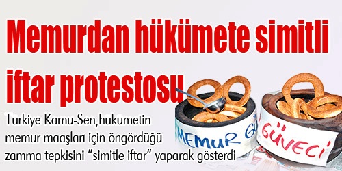 İşte memurun iftar sofrası : 1 Simit, ayran, su Türkiye Kamu-Sen, hükümet’in memur maaşları için öngördüğü zammı “simitle iftar” yaparak protesto etti. Kamu çalışanları Ankara Güvenpark’ta toplanarak, “Memurun iftar sofrası: 1 simit, 1 ayran, 1 su” yazılı pankart açtı. Ezanın okunmasıyla sendika üyeleri oruçlarını ayran, simit ve su ile açtı. Genel Başkan Bircan Akyıldız, “2010 yılı için maaşlara yapılması düşünülen artış, kamu görevlileri ve aileleri için günlük bir simit parası bile etmemektedir” dedi. Akyıldız “Adil ücret hakkı, saygın bir yaşam düzeyi, çalışma haklarının yükseltilmesi gibi haklar hem uluslararası sözleşmelerde hem de Anayasa’mızda yazıyor. Hükümeti, çalışana asgari geçim standartlarında bir ücret vermesi yolunda yükümlülüğe sokuyor. Oysa bu gün siyasi irade, vatandaşını devletine rakip ve sırtına yük olarak görmektedir.” Haber Kaynağı : yenicaggazetesi.com.tr
