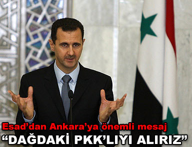 Yarın Türkiye’yi ziyaret edecek olan Suriye Devlet Başkanı Beşar Esad, İstanbul’a gelmeden önce Türkiye’ye “Kürt açılımı” ile ilgili çok önemli bir mesaj gönderdi: “Silah bırakırlarsa dağdaki Suriyeli PKK’lıları alırız” Türkiye ziyareti öncesi Türk gazetecileri kabul eden Suriye Devlet Başkanı Beşar Esad, Ankara’nın son dönemlerde başlattığı açılım politikasının sadece Türkiye’yi değil tüm bölgeyi de olumlu yönde etkileyeceğini söyledi.