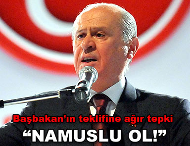 MHP lideri Devlet Bahçeli, Başbakan Recep Tayyip Erdoğan’ın Kürt açılımıyla ilgili görüşme çağrısına yönelik olarak, ”Başbakan’ı namuslu olmaya çağırıyoruz” dedi. MHP, hükümetin Kürt açılımının Meclis’te kapalı oturumda tartışılmasına da karşı çıktı, kapalı oturuma gerek olmadığını belirtti. Başbakan Recep Tayyip Erdoğan’ın muhalefetle görüşme talebi de yine MHP tarafından reddedildi. Bahçeli, partisinin, “TBMM Genel Kurulu’nun açık oturumunda milli hassasiyetleri ilgilendiren her konuyu olduğu gibi bu konuyu da (demokratik açılım) Türk milletinin huzurunda her yönüyle tartışmaya ve Türkiye’nin milli varlığına kastetmeyi amaçlayan bu hain suikastı teşhir etmeye hazır” olduğunu bildirdi.