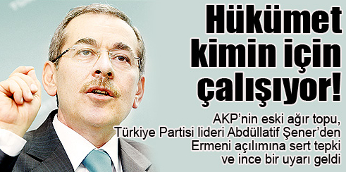 AKP’nin eski ağır topu, Türkiye Partisi lideri Abdüllatif Şener’den Ermeni açılımına sert tepki ve ince bir uyarı geldi: Halkımız, ekonomi ve açılımlar konusunda şu soruyu sormalı: Hükümet kime çalışıyor? Hükümet kime çalışıyor! Protokollerin tek taraflı olarak Ermenistan’a yaradığını ifade eden Şener, “İmzalanan metinde Karabağ işgalinden ve sözde soykırım iddiasından vazgeçildiğine dair bir ifade yok” dedi. Türkiye Partisi Genel Başkanı Abdüllatif Şener, “Halkımız, ekonomi meseleleri ile demokratik açılım, Ermeni açılımı ve diğer konularda şunu sormalıdır: Hükümet kime çalışıyor?” dedi.