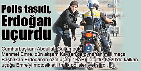 Cumhurbaşkanı Abdullah Gül’ün oğlu Mehmet Emre, dün akşam Kayseri’de oynanan milli maça Başbakan Erdoğan’ın özel uçağı “DAP” ile gitti. 17.20’de kalkan uçağa Emre’yi motosikletli trafik polisleri yetiştirdi. Emre Gül’ü polis taşıdı! Türkiye-Estonya dünya kupası grup elemeleri maçı için dün İstanbul’dan Kayseri’ye giden Başbakan Recep Tayyip Erdoğan, İstanbul Sabiha Gökçen Havalimanı’nda Cumhurbaşkanı Abdullah Gül’ün oğlu Mehmet Emre Gül’ü VİP salonunda bekledi. Başbakan Erdoğan ile birlikte memleketi Kayseri’de maç seyretmek isteyen Mehmet Emre Gül trafikte sıkışınca yolda bulunan bir Motosikletli Şahin Trafik Polisi’nin motorunun arkasına binerek Sabiha Gökçen Havalimanına gitti.