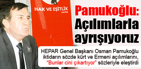 Tartışarak ülkeyi ayrıştırıyorlar HEPAR Genel Başkanı Osman Pamukoğlu, iktidarın sözde Kürt ve Ermeni açılımlarını, “Bunlar cini çıkartıyor” sözleriyle eleştirdi. Hak ve Eşitlik Partisi Genel Başkanı Osman Pamukoğlu, AKP iktidarının “açılım” söylemlerinin boş olduğunu ve sürecin milli mesele olarak yürütülmediğini söyleyerek, “bir siyasi irade, güçlü ve milli irade olmadan; dağların nasıl temizleyeceğini bilmeden bu sorunlar çözülemez” dedi. Pamukoğlu, partisinin birinci kuruluş yıl dönümü nedeniyle yaptığı basın açıklamasında, AKP iktidarının, Ermeni ve Kürt açılımlarına sert tepki gösterdi. “Bu çift sarmal ve batı destekli bir hareket. Lafı gevelemesinler” diyen Pamukoğlu, bu süreçten bir sonuç alınamayacağını, sorunu halkın kararlarının çözebileceğini belirterek, iktidarı referandum yapmaya çağırdı.Dağlar teröristlerden temizlenmeden terör sorununun çözülemeyeceğini vurgulayan Pamukoğlu, “Neyin olacağını arıyorlar. Bir körebe oyunu gibi. Bu böyle olmaz neyin olmayacağını bileceksin” ifadelerni kullandı.