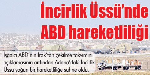 İncirlik’te Amerikan askerine hazırlık İşgal gücü Amerika, 2010 Ağustos’unda Irak’tan tamamen çekilme takvimi üzerinde hesaplar yaparken, Adana’nın İncirlik hava üssünde de yoğun bir hareketlilik yaşanıyor. Bölgede nakliye uçaklarının iniş ve kalkış trafiğinin artması dikkat çekti. Pentagon, 29 Ağustos’ta yaptığı açıklamada çekilmenin Aralık ayı sonuna alınabiliceğini belirtmiş,100 bin askerin Türkiye üzerinden çekilebileceğini belirtmişti. ABD’li Tuğgeneral Brown, Türk siyasilerle görüşüleceğine dikkat çekmişti. Pentagon’dan İncirlik üssündeki 39’uncu Wing Komutanlığı’na gelen yazıda da çekilecek askerlerin İncirlik’te toplanacağı ve sevkiyatın bu üs üzerinden sağlanacağı belirtilmişti. Kaynak : yenicaggazetesi.com.tr