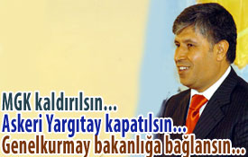 ’MGK kaldırılsın, Genelkurmay, Savunma Bakanlığına bağlansın. Askeri Yargıtay kapatılsın. Jandarma’nın varlığı gözden geçirilsin. Anayasa Mahkemesi üyelerini Meclis seçsin´ Bu çarpıcı öneriler Bolu Valisi Halil İbrahim Akpınar´e ait… Abant Platformu’nun düzenlediği toplantıdaki sözleriyle dikkatleri çeken Bolu Valisi Halil İbrahim Akpınar, şimdi de Milli Güvenlik Kurulu ve Askeri Yargıtay’ın kaldırılmasını, Genelkurmay Başkanlığının da Milli Savunma Bakanlığına bağlanmasını istedi. Kişisel internet sitesinde daha önce de ‘’İrtica lafı da Jakoben markalıdır’’ diyen Akpınar, son yazısında ise 12 Eylül darbesini yapanların yanı sıra, 28 Şubat’a karışanların da yargılanmasını istedi. Vali Akpınar, yeni bir Anayasa da önerdi.