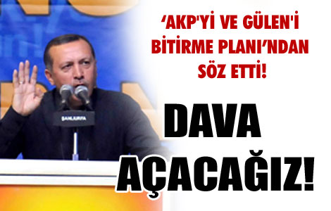 Şanlıurfa’da konuşmasında `AKP’yi ve Gülen’i bitirme planı’ndan söz etti. BAŞBAKAN Recep Tayyip Erdoğan, Genelkurmay Başkanlığı karargahında hazırlandığı iddia edilen `AKP iktidarını devirme ve Gülen’i bitirme planı’ haberiyle ilgili olarak, bunun sorumluları hakkında dava açacaklarını söyledi. Erdoğan, “Son günlerde üzerimizde oynanan oyunları görüyorsunuz. Biz de bu konuları araştırıyoruz. İlgililere gerekli davayı açacağız. AK Parti’ye karşı yapılan gayrihukuki sürece seyirci kalamayız. Ne gerekiyorsa, yapacağız” dedi. Şanlıurfa AKP il kongresine katılmak üzere `Ata’ uçağı ile GAP Uluslararası Havaalanı’na gelen Başbakan Recep Tayyip Erdoğan’ı Şanlıurfa Valisi Yusuf Yavaşcan, kentte bulunan Emniyet Genel Müdürü Oğuz Kağan Köksal, AKP Şanlıurfa milletvekilleri ve AKP’den aday gösterilmediği için bağımsız seçilip ardından SP’ye geçen Belediye Başkanı Ahmet Eşref Fakıbaba ile partililer karşıladı.