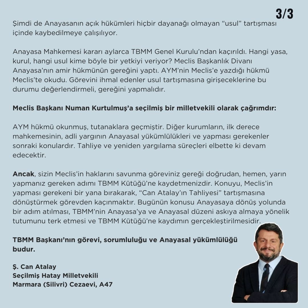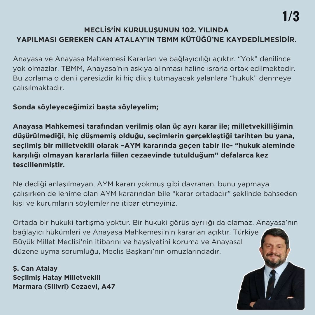 YAPILMASI GEREKEN CAN ATALAY’IN TBMM KÜTÜĞÜ’NE KAYDEDİLMESİDİR.Anayasa ve Anayasa Mahkemesi Kararları ve bağlayıcılığı açıktır. “Yok” denilince yok olmazlar. TBMM, Anayasa’nın askıya alınması haline ısrarla ortak edilmektedir. Bu zorlama o… pic.twitter.com/3QRCJgbW1h