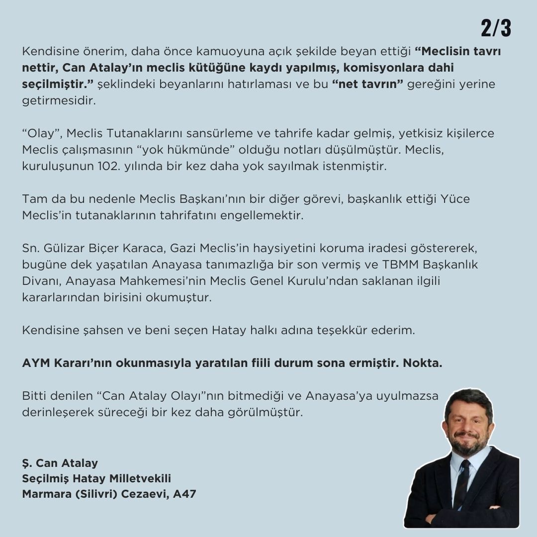Atalay, TBMM Başkanı Numan Kurtulmuş’un geçmişte yaptığı, “Meclisin tavrı nettir, Can Atalay’ın kütüğe kaydı yapılmış, komisyonlara seçilmiştir” açıklamalarını hatırlatarak, bu sözlerin gereğinin yerine getirilmesini istedi.