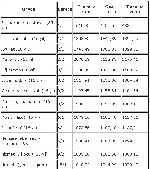 1 Ocak 2010’dan itibaren 16 yıllık çalışması olan avukatın maaşı 43,54, öğretmenin maaşı 34,96, imamın maaşı 32,42, hemşirenin maaşı 30,91 ve lise mezunu memurun maaşı 26,84 lira artacak. Gelecek yılın ikinci yarısında ise Başbakanlık Müsteşarı’nın maaşı 4 bin 834,65 liraya ulaşacak.