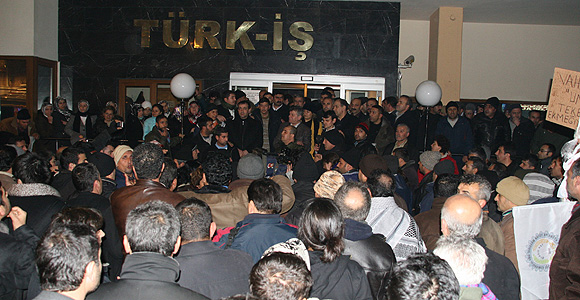 Geceyi Türk-İş Genel Merkezi’nde, yere serdikleri kartonlar üzerinde ve konferans salonunda geçiren işçiler, sabahın erken saatlerinden itibaren genel merkez önünde toplanarak “Türkiye sevdamız, ekmek için kavgamız”, “Direniş var yılgınlık yok”, “Direne direne kazanacağız’ sloganları attı.