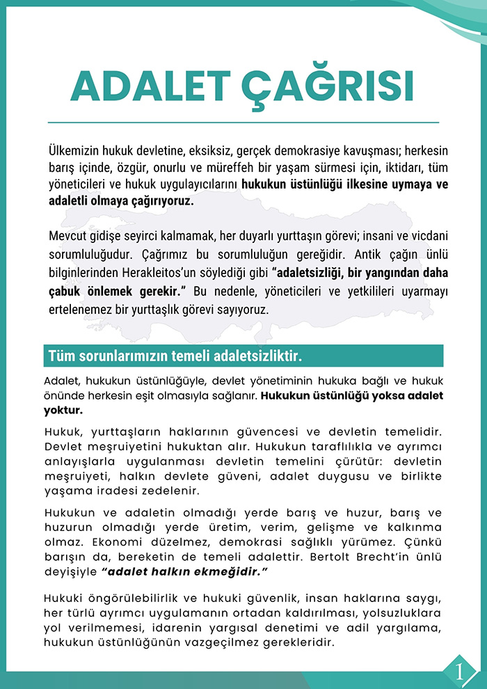 Cumhuriyet’te yer alan habere göre, bildiride Türkiye’de hukuk sisteminin siyasetin etkisi altına girdiği vurgulandı. Eski bakanlar, akademisyenler ve hukukçuların imzasını taşıyan çağrıda, “Adaletsizlik bir beka sorunudur. Hukukun üstünlüğü yoksa adalet de yoktur” ifadeleri yer aldı.