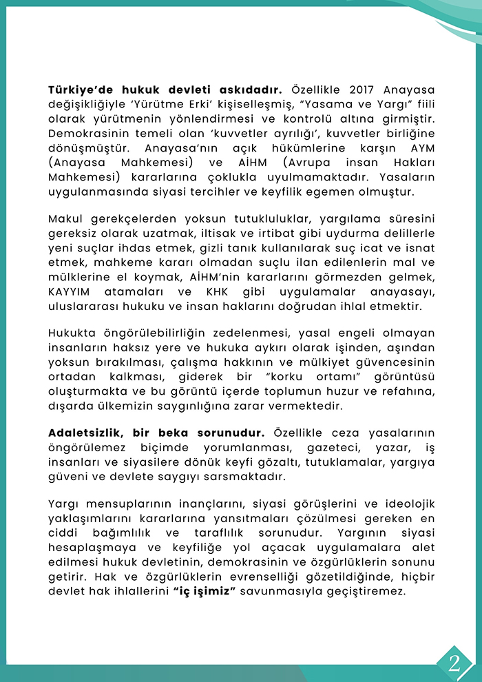 2017 Anayasa değişikliği sonrası kuvvetler ayrılığının ortadan kalktığına dikkat çekilen metinde, Anayasa Mahkemesi ve AİHM kararlarının uygulanmaması, keyfi tutuklamalar ve ‘gizli tanık’ uygulamaları eleştirildi.