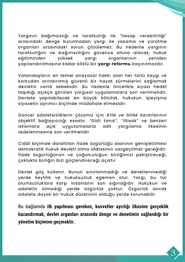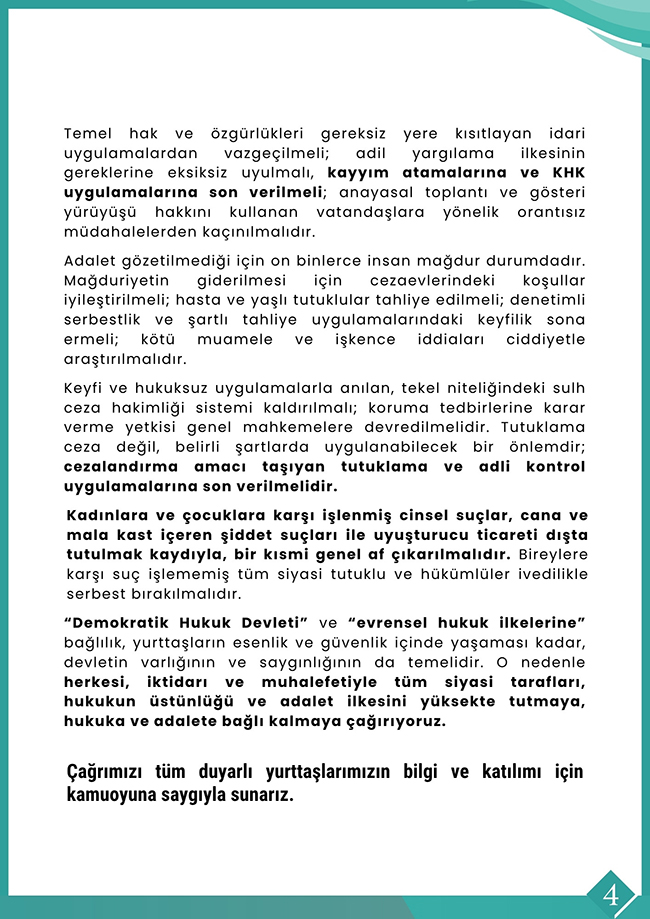 Metinde “Temel hak ve özgürlükleri gereksiz yere kısıtlayan idare uygulamalardan vazgeçilmeli; adil yargılama ilkesinin gereklerine eksiksiz uyulmalı, kayyım atamalarına ve KHK uygulamalarına son verilmeli; anayasal toplantı ve gösteri yürüyüşü hakkını kullanan vatandaşlara yönelik orantısız müdahalelerden kaçınılmalıdır” dendi.