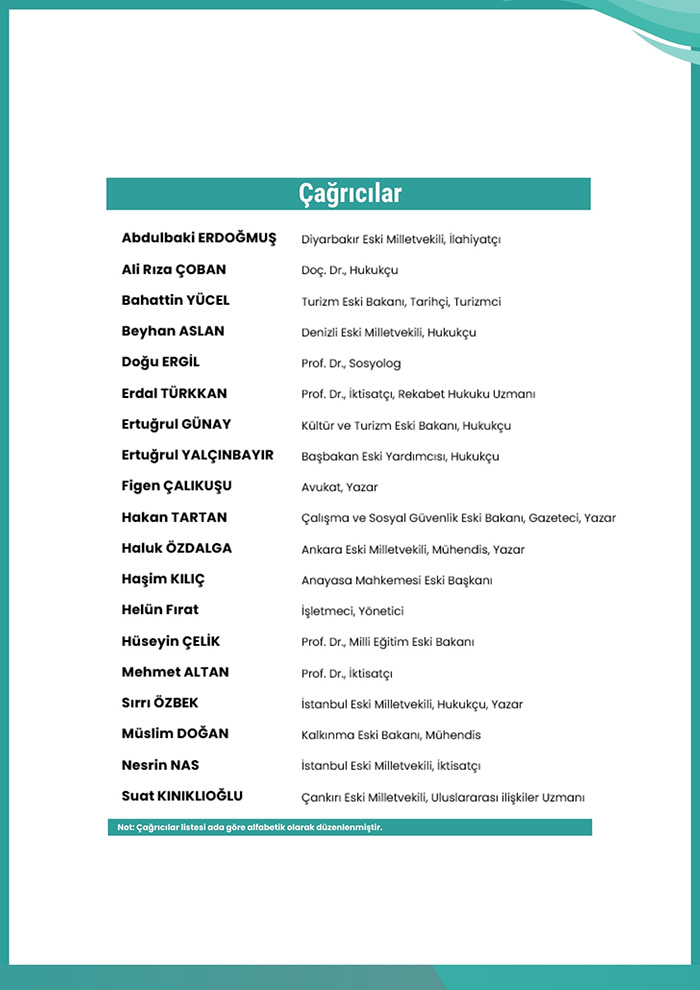 Hüseyin Çelik, Haşim Kılıç, Ertuğrul Günay, Bahattin Yücel, Ertuğrul Yalçınbayır, Figen Çalıkuşu, Hakan Tartan, Haluk Özdalga, Nesrin Nas, Mehmet Altan, Doğu Ergil, Abdulbaki Erdoğmuş, Beyhan Aslan, Müslim Doğan, Sırrı Özbek, Suat Kınıklıoğlu, Erdal Türkkan, Ali Rıza Çoban ve Helün Fırat.