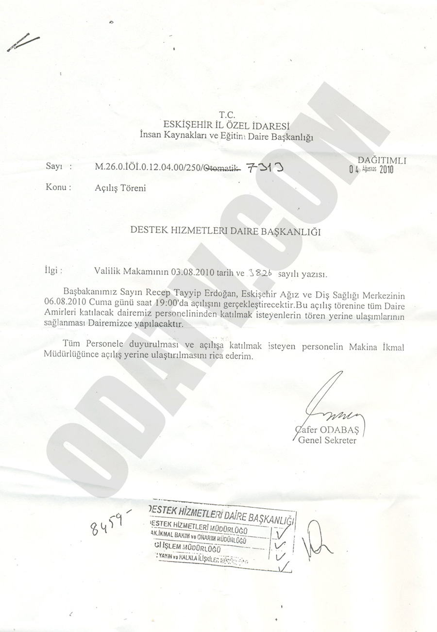 Görüleceği üzere; söz konusu belgenin altında Cafer Odabaş imzası bulunuyor. Odabaş bu belgeyi, Eskişehir İl Özel İdaresi Genel Sekreteri unvanıyla imzalıyor.