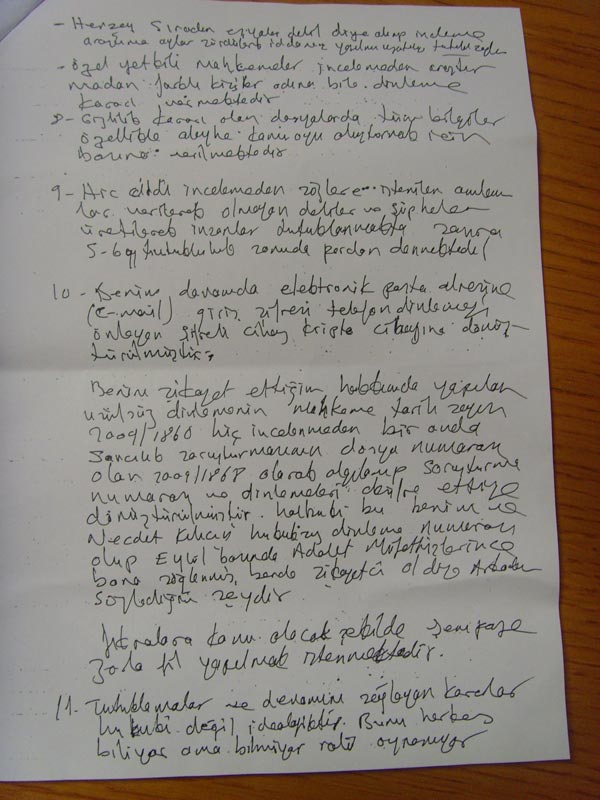 10. Benim davamda elektronik posta adresindeki (e mail) giriş şifresi, telefon dinlemeyi önleyen şifreli cihaz (kripto cihazına) dönüştürülmüştür. Şikayet ettiğim ve hakkımda yapılan usulsüz dinlemenin mahkeme tarih sayısı 2009/1860’dır. Hiç incelemeden savcılık soruşturmasında, dosya numaram olan 2009/1868 olarak algılanıp, soruşturma numaram ile (Dinlemeleri deşifre etti) denilmiştir. Halbuki bu benim ve Necdet Kılıç hukuksuz dinleme numaram olup, Eylül başında Adalet Müfettişlerince bana söylenmiş bende şikayetçi ol diye arkadaşa söylediğim şeydir. Fıkralara konu olacak şekilde şempanze zorla fil yapılmak istenmektedir.