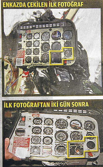 BBP Lideri Muhsin Yazıcıoğlu’nun yaşamını yitirdiği helikopter kazasıyla ilgili olarak DDK’nın açıkladığı raporda yer alan helikopterin uçuş bilgilerini taşıyan cihazların enkazdan çalındığı iddiası dün ortaya çıkan fotoğrafla güçlendi. Dün yayımlanan fotoğrafta GPS ile SKYMAP IIIC adlı cihazlar helikopterin üzerinde görünürken iki gün sonra çekilen fotoğrafta ise iki cihazın yerinde olmadığı, bağlı oldukları pa-nelden söküldükleri görülüyor.