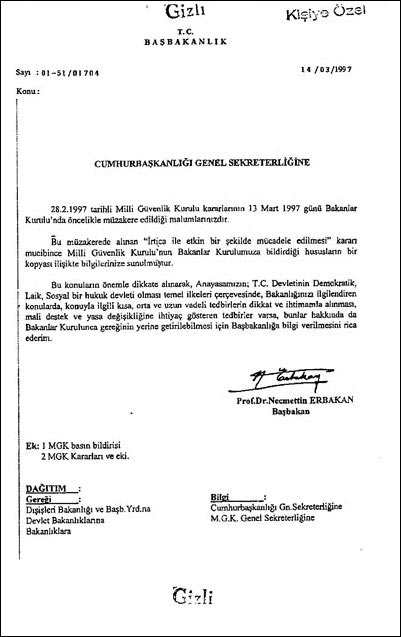 Erbakan, 13 Mart’ta yapılan Bakanlar Kurulu toplantısının ertesi günü de Başbakan Yardımcısı Tansu Çiller ile bütün bakanlıklara bir yazı göndererek 28 Şubat kararlarını iletiyor ve bakanlıklardan gerekli gördükleri tedbirleri Başbakanlığa bildirmesini istiyor.