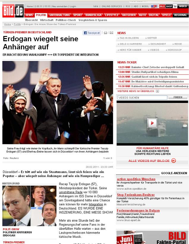 Alman gazetesi Bild, Düsseldorf’ta miting gibi toplantı yapan Başbakan Erdoğan’a yükleniyor. Bild, “Ülkemizde seçim kampanyası yapıyor. Uyumu torpilliyor. Nefret vaizi (Hassprediger) gibi taraftarlarını kışkırtıyor” derken, ülkedeki Türkler’in durumunu sorguluyor.
