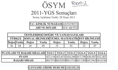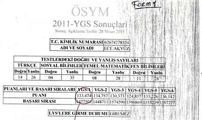 Sonuç formunda Ece Akyüz’ün 427 puan aldığı ve LYS’ye girebileceği yazıyordu. Genç kız, Türkçe’den 36, Sosyal Bilimler’den 30, Matematik’ten 35 ve Fen Bilimleri’nden 32 soruya doğru cevap vermişti. (NTV)