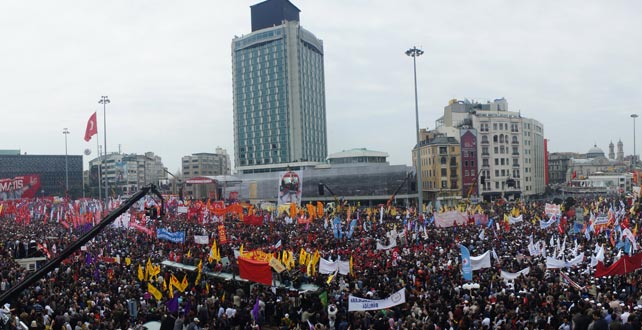 Bu arada, 1 Mayıs Emek ve Dayanışma Günü kutlamaları kapsamında Taksim Meydanı’ndaki The Marmara Oteli önüne kürsü hazırlandı. Kürsünün üzerine ”Emek, Barış, Demokrasi ve Özgürlük” ile Kürtçe ve Türkçe olarak ”Yaşasın 1 Mayıs” yazıları bulunan pankartlar asıldı. Ayrıca Atatürk Kültür Merkezi önünde vinçlerden ”Tüm işçi ve emekçilerin bayramını kutlarız”, The Marmara Oteli önünde de ”1 Mayıs” yazan büyük boy pankartlar yer aldı.