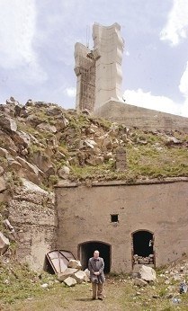 Otomobille tırmanarak çıktığımız Üçler Tepesi’nde kafası kopartılmış olan anıtın ana gövdesi ve onun yanında yükselen dev bir vinç karşıladı bizi.