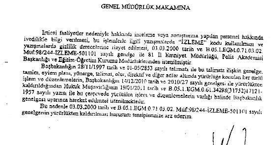 28 Şubat süreci sonrası kamudaki irticai faaliyetlerin takibi amacıyla çıkarılan genelgenin, Başbakan Recep Tayyip Erdoğan’ın talimatıyla kaldırılmasının ardından, Emniyet Genel Müdürlüğü de (EGM) benzer içerikteki genelgesini yürürlükten kaldırdı.
