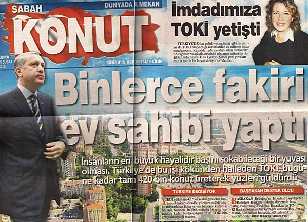 Sabah Gazetesinin bugün verdiği konut ekinde Başbakanlığa bağlı Türkiye’nin en büyük şirketlerinden olan TOKİ’nin inşaat faaliyetleri hükümetin icraati gibi verilerek vatandaşın konut umudunun AK Parti hükümetinde olduğu imajı oluşturuldu.