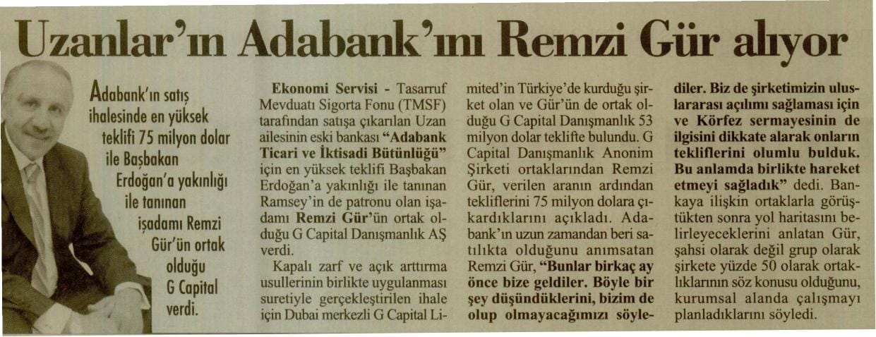 Ekonomi Servisi – Tasarruf Mevduatı Sigorta Fonu (TMSF) tarafından satışa çıkanlan Uzan ailesinin eski bankası “Adabank Ticari ve Iktisadi Bütünlüğü” için en yüksek teklifi Başbakan Erdoğan’ a yakınlığı ile tanınan Ramsey’in de patronu olan işadamı Remzi Gür’ün ortak olduğu G Capital Danışmanlık AŞ verdi.