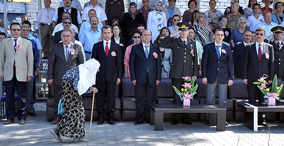 Çarşı merkezine doğru giden yaşlı kadının ağır adımlarla geçişi sırasında, Vali Erdoğan Bektaş ile birlikte protokol tribünündeki herkesin saygı duruşunda bulunması ortaya ilginç görüntüler çıkardı.