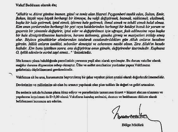 “Plana bakıldığında parselimizin yarısı yeşil alan olarak ayrılmıştır. Bu durum, vakıflar olarak mağdur duruma düşmemize sebep oldu. Ülke ve millet menfaatlerine yardımlar yapan vakfımızın gelirinin düşürülmemesi gerekmektedir. Vakfımıza ait bu arsa, kurumunuza başvurmuş bir şahıs veyahut şirket arazisi olarak değerlendirilmemelidir. Devletimize ve milletimize ait olan bu arsanın, yapılacak plan tadilatıyla değeri ve geliri artacaktır. Bu nedenle askıda bulunan plana itiraz ediyor ve parselimizin tamamının ticaret ve hizmet alanına alınmasını, Vakıflar’ın kuruluş nedenini, duasını ve bedduasını dikkate alarak belirlenmesi hususunu arz ederim.’ Vakıfların son itirazını belediye meclisi kasım ayı oturumunda karara bağlayacak.