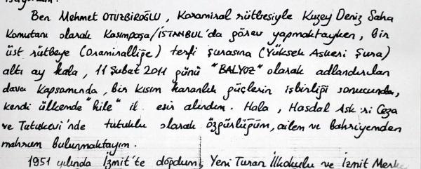 “Ben Mehmet Otuzbiroğlu. Koramiral rütbesi ile Kuzey deniz Saha Komutanı olarak Kasımpaşa İstanbul’da görev yapmakta iken bir üst rütbeye (Oramiralliğe) terfi şurasına (Yüksek Askeri Şura) 6 ay kala, 11 Şubat 2011 günü (Balyoz) olarak adlandırılan dava kapsamında, bir kısım karanlık güçlerin işbirliği sonucunda kendi ülkemde hile ile esir alındım. Hala Hasdal Askeri Ceza ve Tutukevi’nde tutuklu olarak özgürlüğüm, ailem ve bahriyemden mahrum bulunmaktayım.”
