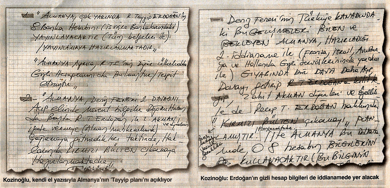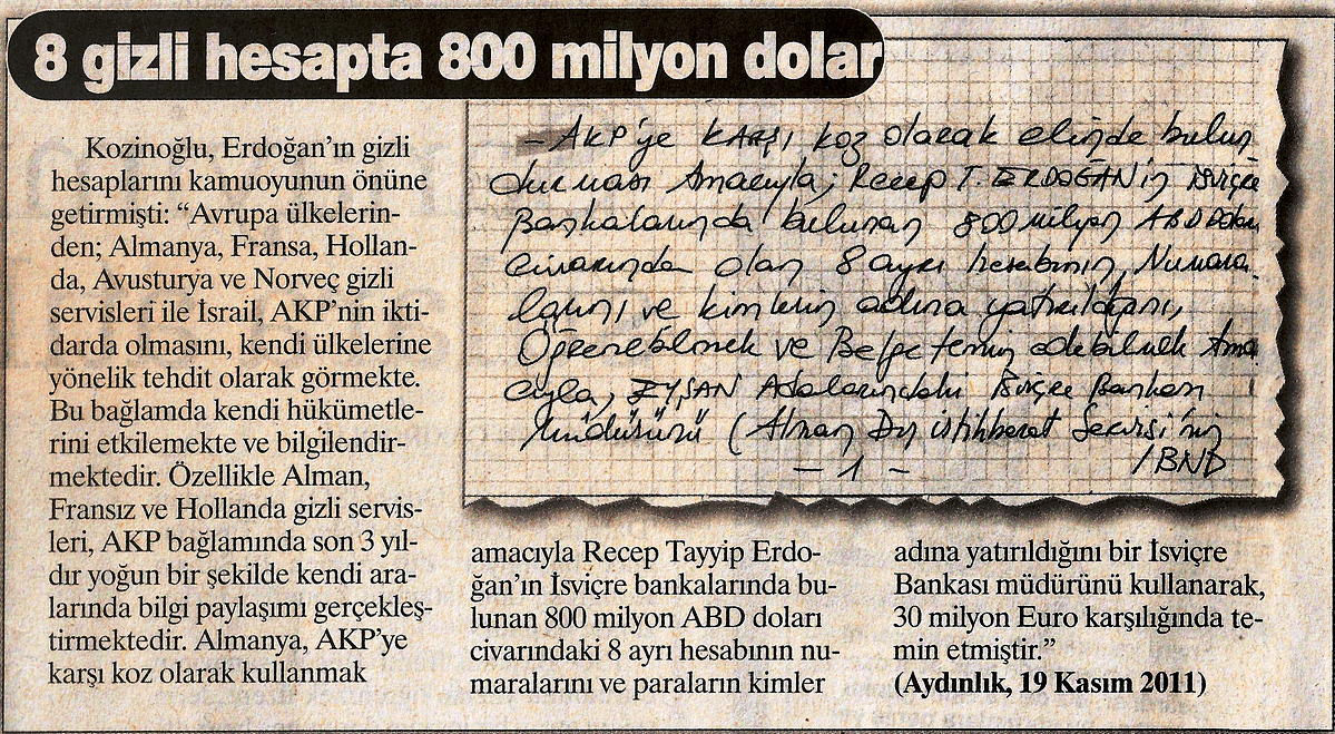 MİT Orta Asya Başmüşaviri Kaşif Kozinoğlu, ölmeden önce kendi el yazısı ile Aydınlık’a yaptığı açıklamada, Alman devletinin Tayyip Erdoğan’ın İsviçre bankalarındaki gizli hesap bilgilerini açıklamaya hazırlandığını ifade etti. Daha önce Aydınlık’ta yayımlanan açıklamalarında Kozinoğlu, Alman istihbarat örgütü BND’nin Erdoğan’ın İsviçre bankalarındaki 8 ayrı gizli hesapta 800 milyon doları olduğunu saptadığını, BND’nin Erdoğan’ın gizli hesap bilgilerini 30 milyon dolar karşılığında İsviçre’de bir banka müdüründen temin ettiği belirtmişti. Diğer yandan Kozinoğlu, Almanya’nın 2. Deniz Feneri davasını açmaya hazırlandığını da belirterek , “Alman mahkemeleri bu dava kapsamında Başbakan Tayyip Erdoğan’ı ifade vermeye çağıracak” diyor. Zahit Akman ile birlikte Deniz Feneri sanıklarını da ifadeye çağıracağını belirten Kozinoğlu, ifadeye çağrılanların gitmemesi durumunda Almanya’nın haklarında “kırmızı bülten” çıkartacağını açıklıyor.