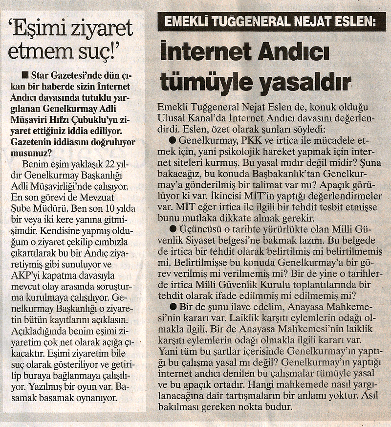 Tayyip Erdoğan’ın da bilgisi dahilinde Genelkurmay Başkanlığı’nca irticai faaliyetlere karşı oluşturulan internet siteleri dava konusu oldu. İddianameyi hazırlayan savcı, bu internet sitelerinin suç unsuru olduğunu öne sürdü. Bu siteleri oluşturmak ya da yönetmek suç mudur?