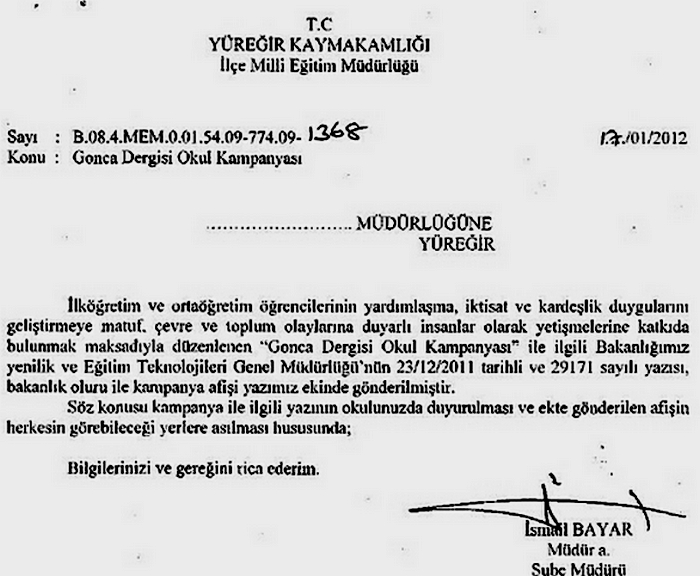 “İlköğretim ve ortaöğretim öğrencilerinin yardımlaşma, iktisat ve kardeşlik duygularını geliştirmeye matuf, çevre ve toplum olaylarına duyarlı insanlar olarak yetişmelerine katkıda bulunmak maksadıyla düzenlenen, “Gonca Dergisi Okul Kampanyası” ile ilgili Bakanlığımızın Yenilik ve Eğitim Teknolojileri Genel Müdürlüğü’nün 23/12/2011 tarihli ve 29171 sayılı yazısı, bakanlık oluru ile kampanya afişi yazımız ekinde gönderilmiştir.