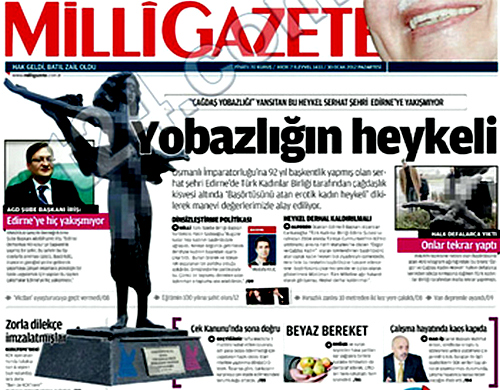 Milli Gazete’nin üst başlığında “Çağdaş yobazlığı yansıtan bu heykel serhat şehri Edirne’ye yakışmıyor” dediği ve “Yobazlığın Heykeli” başlıklı haber şöyle: