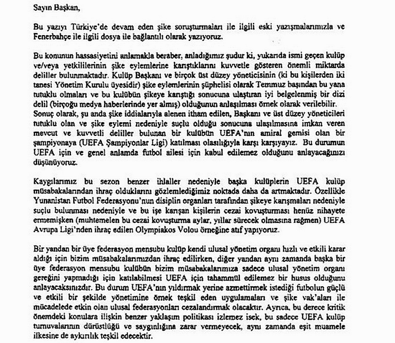 HERNEYSE.. Şimdi size UEFA Genel Sekreteri Giovanni Infantino imzalı yazının önemli yerlerini yayınlıyoruz: “Şu anda şike iddialarıyla alenen itham edilen, başkanı ve üst düzey yöneticileri tutuklu olan ve şike eylemi nedeniyle suçlu olduğu sonucuna ulaşılmasına imkan veren mevcut ve kuvvetli deliller bulunan bir kulübün UEFA’nın amiral gemisi olan bir şampiyonaya katılması olasılığıyla karşı karşıyayız. Bu durumun UEFA için ve genel anlamda futbol ailesi için kabul edilemez olduğunu anlayacağınız düşünüyorum.